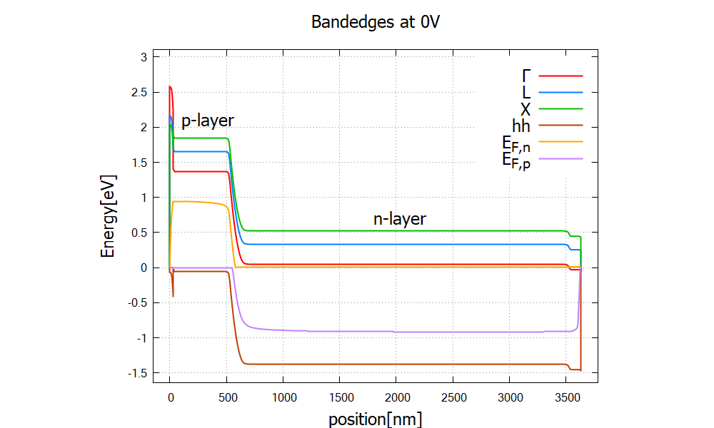 Figure 2.5.57 Band edges and quasi-Fermi levels of the solar cell at zero bias bias_000000/bandedges.dat (nextnano++) / band_structure/BandEdges.dat (nextnano³)
