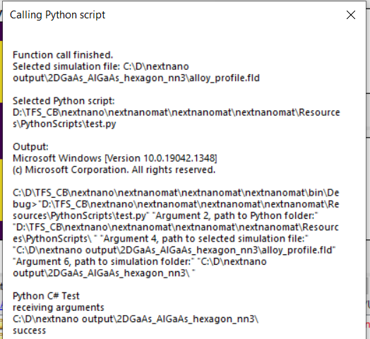 Custom written python scripts can be called directly from the Output tab. The parent folder of the python script, Path to the currently displayed output file as well as the path to the simulation folder are transferred as system arguments, see Figure 1.5.23. (If you need other specific information to be exported, just mail your request to the nextnano support team or use the widget on this website.) By using those system arguments in your python script, individual post-processing of specific output files is reduced to a one-click effort.