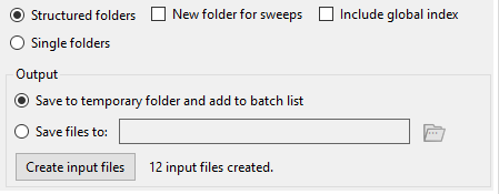 Either the option Single folders or Structured folders can be selected. The first option generates one unique simulation output folder for each input file (ergo, for this example separate 12 folders, see Figure 1.1.15), whereas the structured option generates nested output folders matching the sweep structure. For the structured option a global index can be included which enumerates each sweep (Figure 1.1.16). And/Or a parent folder - for each sweep - can be added (Figure 1.1.17).