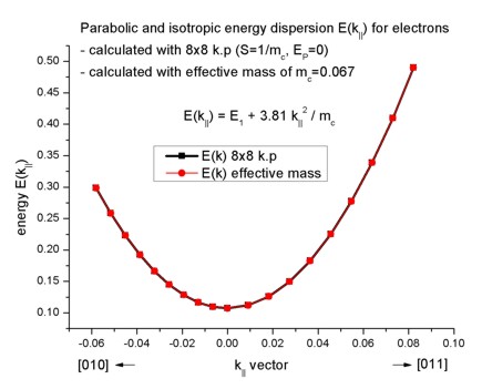 where hbar²/2m0 is given by 3.81 [eV Angstrom²] and the conduction band effective mass mc is a dimensionless quantity here in this equation. k|| is given in [1/Angstrom]. E1 is the energy of the lowest eigenstate E1 = 0.10707 eV. As expected, the dispersion for the effective-mass approximation agrees perfectly to the 8-band k.p case.