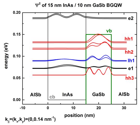 One can see a slight hybridization of the e1 and lh1 states, i.e. these states are mixed states whereas the heavy hole states (hh1, hh2, hh3) are not mixed and thus confined in the GaSb layer.
