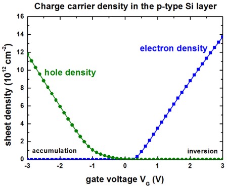 whereas in the inversion regime the electron density dominates the device