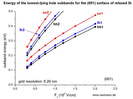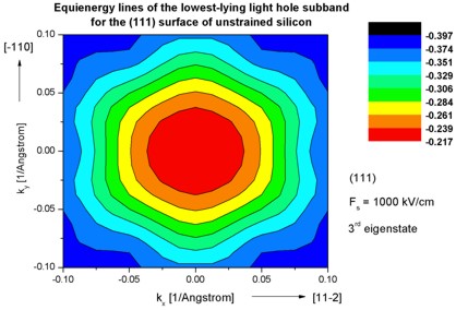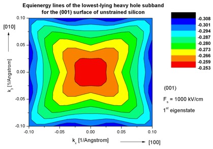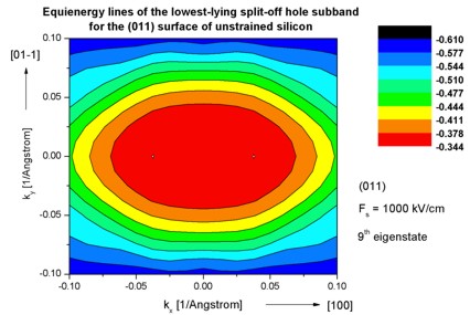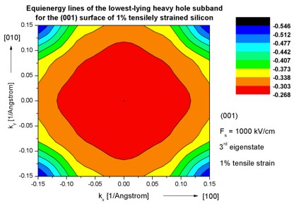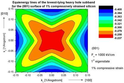 silicon calculated using a strain dependent 6-band k.p Hamitonian. Only one spin
