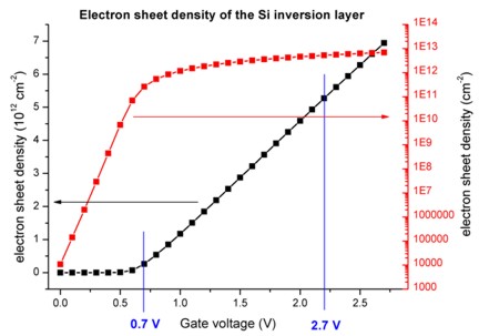 The applied gate voltage leads to confined electron states at the p-Si / SiO2