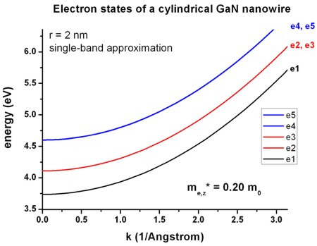 • The following figure shows the electron states as a function of k of the GaN nanowire. It is in excellent agreement with Fig. 1 of the above cited paper. All states are two-fold degenerate due to spin. In addition, the 2nd and 3rd state are degenerate, as well as the 4th and the 5th.