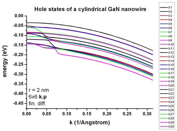 • The following figure shows the hole states as a function of k of the GaN nanowire as calculated with 6-band k.p theory. It corresponds to Fig. 2 and Fig. 3 of the paper of Zhang and Xia. Note that the authors assumed the hole energies to be positive.