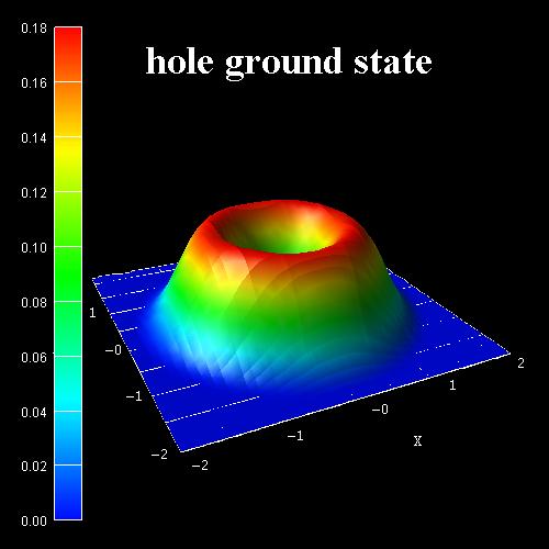 • The following figures show the ground state wave function (psi²) of the hole (left figure) and the 1st excited hole state (right figure) as calculated within the 6-band k.p approximation at k = 0.