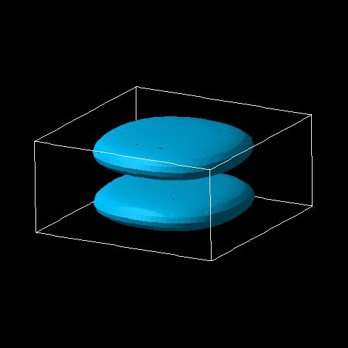 The following figures show the isosurfaces of the electron wave function (psi²) of a 10 nm cubic quantum dot with infinite barriers for